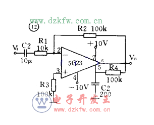圖 11 是帶調零端的同相輸出運放電路。引腳 1 、 11 、 12 是調零端,調整 RP 可使輸出端( 8 )在靜態時輸出電壓為零。 9 、 6 兩腳分別接正、負電源。輸入信號接到同相輸入端( 5 ),因此輸出信號和輸入信號同相。放大器負反饋經反饋電阻 R2 接到反相輸入端( 4 )。同相輸入接法的電壓放大倍數總是大于 1 的。