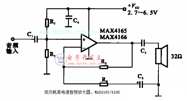 上圖所示是一種采用運(yùn)算放大器MAX4165/66的低功耗單電源音頻放大電路,音頻信號(hào)經(jīng)耦合電容器其cl后,經(jīng)運(yùn)算放大器放大后輸出驅(qū)動(dòng)揚(yáng)聲器發(fā)聲。