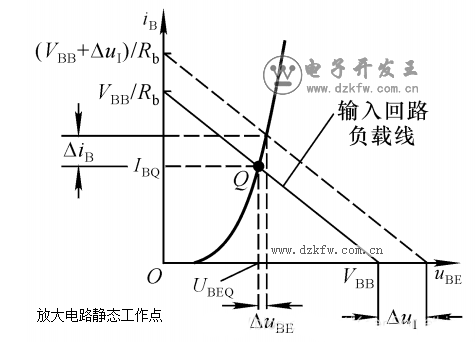 1,當輸入信號∆ui=0時,有輸入回路方程uBE = VBB – iB*Rb,是一條直線。在輸入特性坐標系中,輸入特性曲線與輸入回路直線方程交點就是靜態工作點Q。