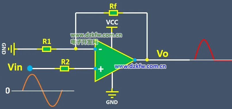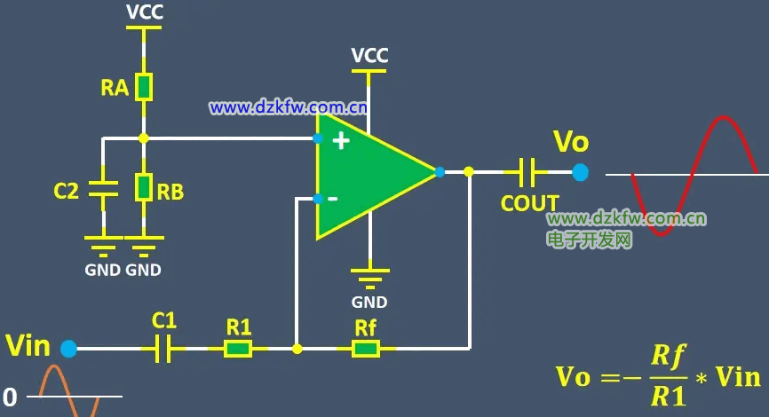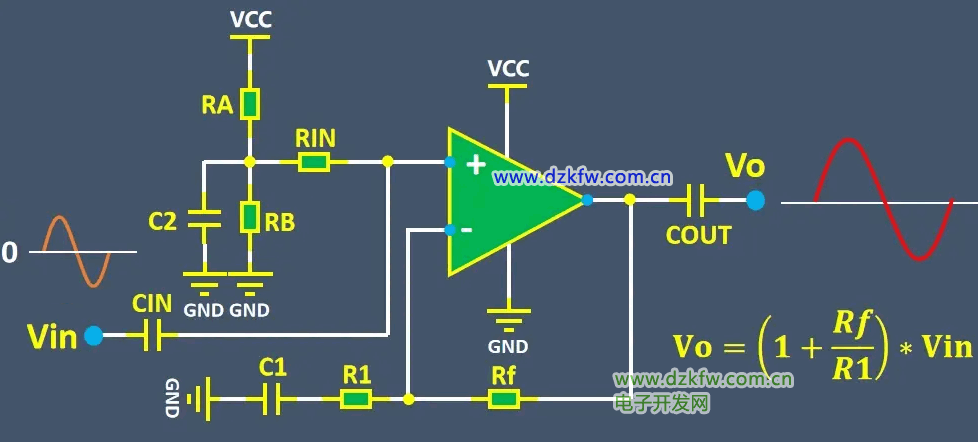 輸出電壓等于1+Rf/R1*Vin,這樣就實現了單電源運放對交流信號的放大。
