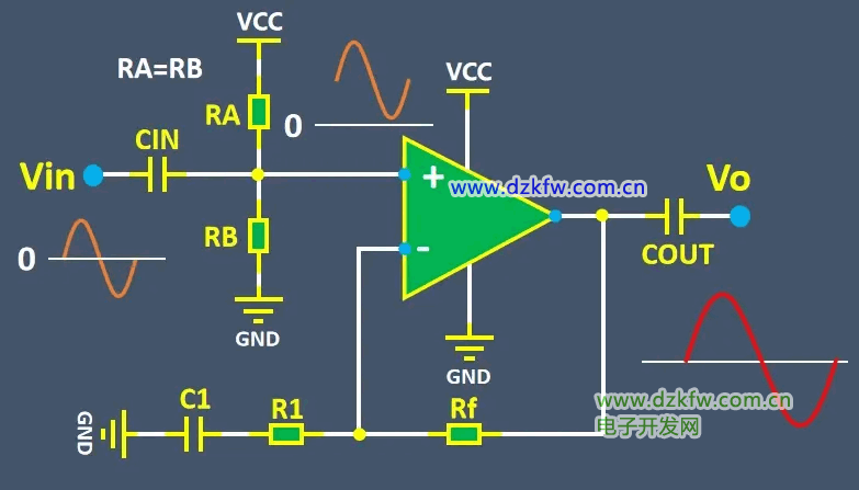 當信號輸入在運放的同相端時,我們在通過兩個阻值相等的電阻分壓來給運放的同相端產生二分之一VCC的電壓,這個電壓就是我們添加的偏置電壓,輸入信號經過電容后整體將會抬升二分之一VCC,從而輸入信號全部變成了正電壓。