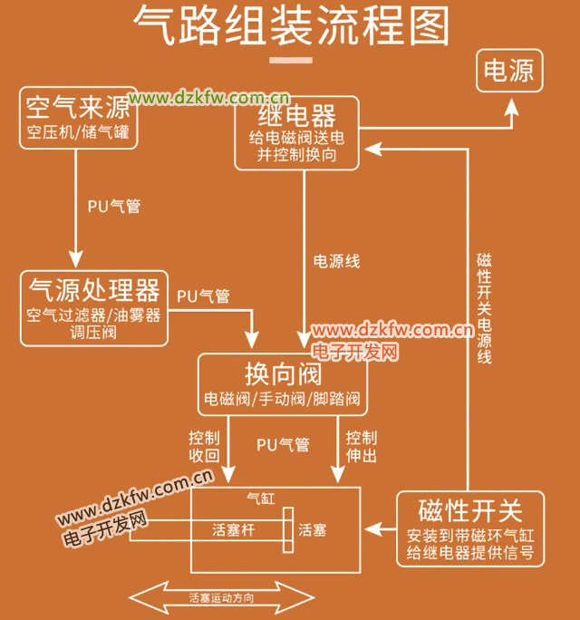 電磁閥主要由電氣部分和機械部分組成,通過給閥頭通電實現氣體流向的改變,從而帶動氣缸的伸出和縮回動作。