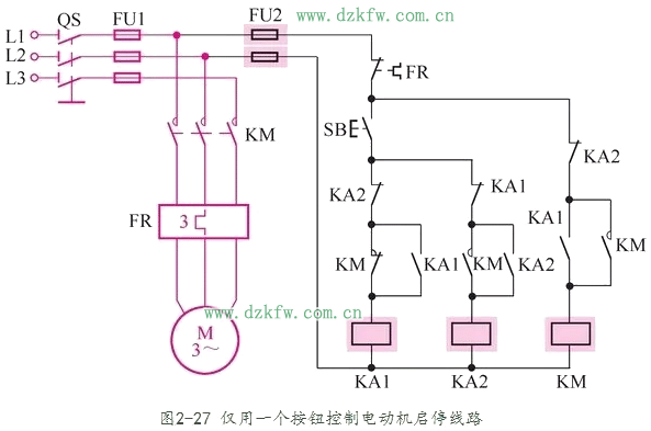 僅用一個按鈕控制電動機的啟動和停止線路如圖2-27所示。 當啟動時, 按下按鈕SB, 繼電器KA1線圈得電吸合, KA1常開觸點閉合, 交流接觸器KM線圈通電, KM吸合并自鎖, 電動機啟動, KM的常開輔助觸點閉合, 常閉輔助觸點斷開, 這時, 繼電器KA2的線圈因KA1的常閉觸點已斷開而不能通電, 所以KA2不能吸合。 松開按鈕SB, 因KM已自鎖, 所以交流接觸器KM仍吸合, 電動機繼續(xù)運轉。但這時KA1因SB被松開而斷電釋放, 其常閉觸點復位, 為接通KA2做好準備。