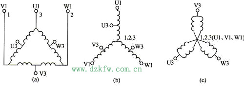 雙速電動機的定子繞組的聯(lián)接方式常有兩種:一種是繞組從三角形改成雙星形,如下圖 (a)所示的連接方式轉(zhuǎn)換成如圖(c)所示的連接方式,另一種是繞組從單星形改成雙星形,如圖(b)所示的連接方式轉(zhuǎn)換成如圖(c)所示的連接方式,這兩種接法都能使電動機產(chǎn)生的磁極對數(shù)減少一半即電動機的轉(zhuǎn)速提高一倍。