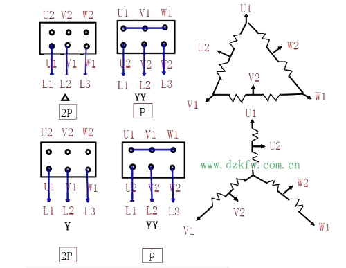 2.繞組從三角形改成雙星形(Y形),如上圖(右)所示三角形改為雙星形,也使磁極對數(shù)減小一半,而得到調(diào)速效果。這種變極調(diào)速后,電動機的額定功率基本上不變,但是額定轉(zhuǎn)矩幾乎要減小一半,所以這種接法適合用于拖動恒功率性質(zhì)的負載,如各種金屬切削機床。