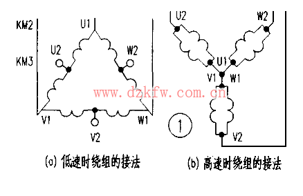 雙速電動(dòng)機(jī)屬于異步電動(dòng)機(jī)變極調(diào)速,是通過(guò)改變定子繞組的連接方法達(dá)到改變定子旋轉(zhuǎn)磁場(chǎng)磁極對(duì)數(shù)。從而改變電動(dòng)機(jī)的轉(zhuǎn)速。根據(jù)異步電動(dòng)機(jī)的同步轉(zhuǎn)速與磁極對(duì)數(shù)成反比。即磁極對(duì)數(shù)增加一倍。同步轉(zhuǎn)速下降至原轉(zhuǎn)速的一半,電動(dòng)機(jī)額定轉(zhuǎn)速也將下降近一半的原理,通過(guò)改變磁極對(duì)數(shù)達(dá)到改變電動(dòng)機(jī)轉(zhuǎn)速的目的。其定子繞組接線如上圖所示。當(dāng)然,這種調(diào)速方法是有級(jí)的,不能平滑調(diào)速。而且只適用于鼠籠式電動(dòng)機(jī)。對(duì)于主控電路,可采用以接觸器或者時(shí)間繼電器等來(lái)構(gòu)建雙速電動(dòng)機(jī)調(diào)速電路。