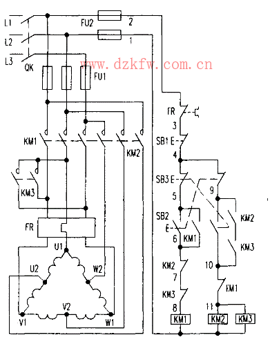 如中圖所示。其控制電路主要由兩個(gè)復(fù)合按鈕各三個(gè)接觸器線圈組成。在主電路中。電動(dòng)機(jī)繞組連接成三角形,在三個(gè)頂角處引出U1、V1、W1;在三相繞組各自的中間抽頭引出U2、V2、W2。其中,Ul、Vl、Wl與接觸器KMl主觸點(diǎn)連接。U2、V2、W2與KM2的主觸點(diǎn)連接。U1、V1、W1三者又與接觸器KM3主觸點(diǎn)連接。