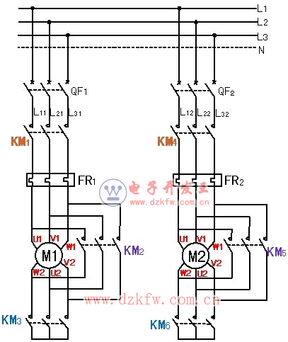 當(dāng)生活水泵電動機(jī)容量較大時通常采用星三角形降壓啟動,鼠籠式異步電動機(jī)的降壓啟動方式有自耦變壓器降壓啟動、星三角形降壓啟動等多種降壓方式。下面以星三角形降壓啟動為例說明。此例在高位水箱中設(shè)置水位信號器,采用干簧式開關(guān)作為水位信號器對電動機(jī)進(jìn)行控制以供生活給水之用。水泵電動機(jī)一臺為工作泵,另一臺為備用泵。