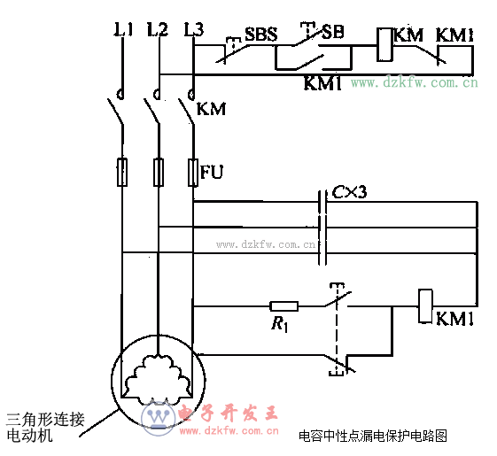 利用電容元件作為輔助中性點的電壓型漏電保護電路,如圖所示。電容的選用應考慮電容值、耐壓的一致,耐壓應大干400V。電氣原理圖如下: