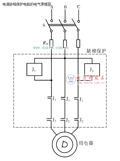 三相電動(dòng)機(jī)在運(yùn)轉(zhuǎn)中如長(zhǎng)時(shí)間缺相運(yùn)行,電動(dòng)機(jī)就會(huì)因繞組電流過(guò)大發(fā)熱而被燒毀。如果是在啟動(dòng)時(shí)缺相,電動(dòng)機(jī)就會(huì)嗡嗡作響而轉(zhuǎn)不起米,甚至發(fā)熱而被燒毀。如使用三相電源的柜式空調(diào)機(jī),缺相也有燒壞壓縮機(jī)的可能,會(huì)造成較大的經(jīng)濟(jì)損失。本文介紹的電路可以克服這一缺點(diǎn),如圖所示。