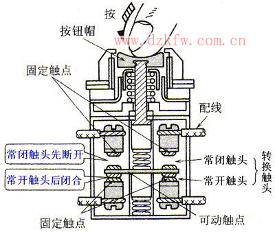 按鈕開關的結構:由按鈕帽、復位彈簧、固定觸點、可動觸點、外殼和支柱連桿等組成。