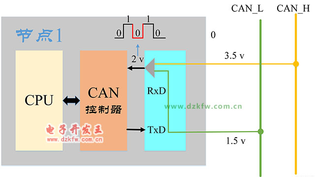CAN的數據總線有兩條,一條是黃色的CAN_High,一條是綠色的CAN_Low。當沒有數據發送時,兩條線的電平一樣都為2.5V,稱為靜電平,也就是隱性電平。當有信號發送時,CAN_High的電平升高1V,即3.5V,CAN_Low的電平降低1V,即1.5V。