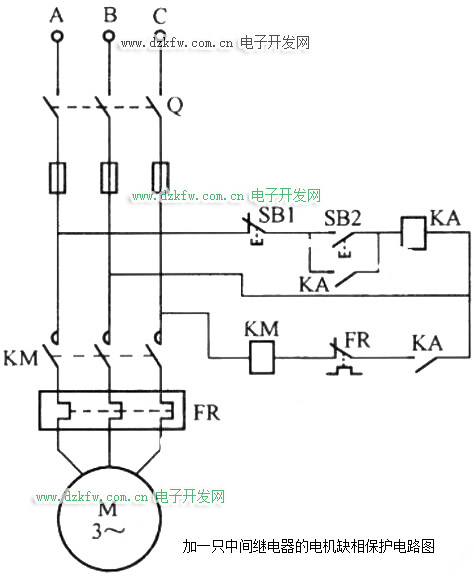 該電路是在電動機單向運轉電路的基礎上,加裝一只中間繼電器來實現缺相保護的電路。