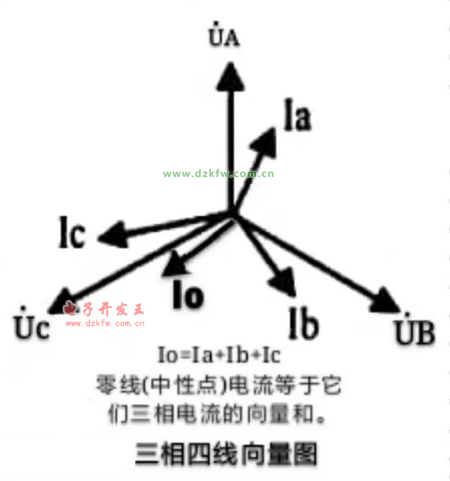 值得注意的是,三相四線制交流電路中的零線上的電流不可能比任意一根相線上的電流大。因為在負載星形連接時,零線電流為各相電流的向量和,在三相對稱電路中,流過各相負載的電流應該相等,而且每相電流間的相位差為120°,其相量圖以U相電流為參考,見下圖所示