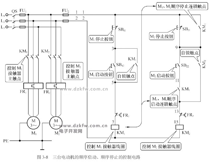 ② 順序停止:控制先啟動電動機的接觸器的動合觸點,并聯在相聯的控制后啟動的電動機接觸器的停止按鈕兩端,可滿足順序停車的控制要求。