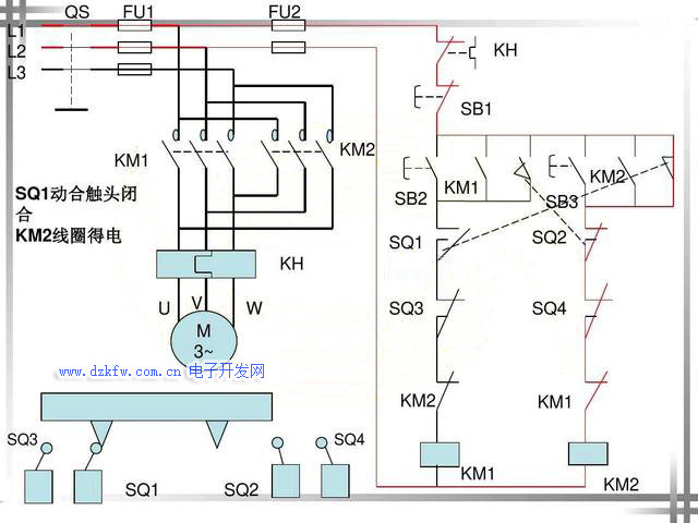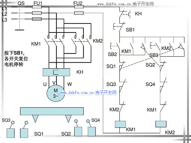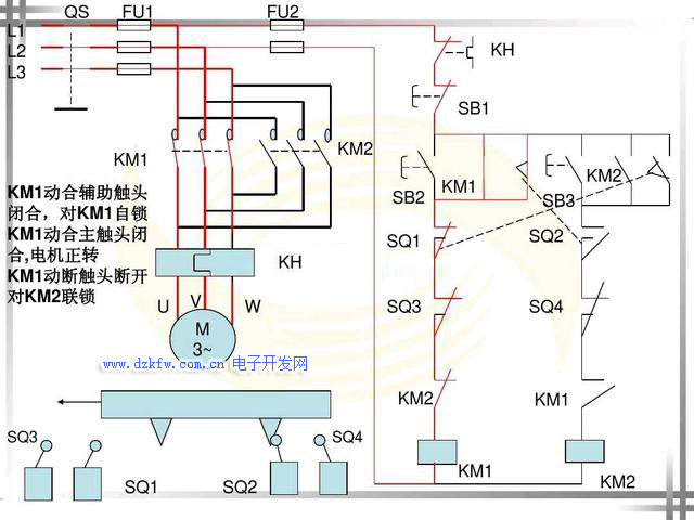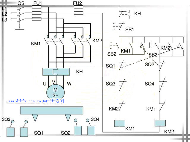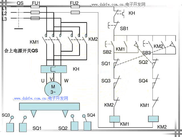 注明:行程開關(guān)SQ3,行程開關(guān)SQ4位于工作臺(tái)的兩側(cè),目的在于對(duì)電路進(jìn)行極限保護(hù),即雙重行程開關(guān)用來停止電動(dòng)機(jī)的極限運(yùn)行,相對(duì)的更加的安全,可靠和實(shí)用。