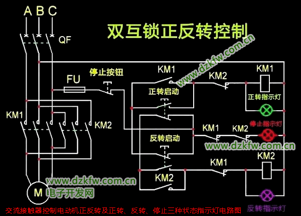 交流接觸器控制電動機正反轉及正轉、反轉、停止三種狀態指示燈電路圖,見下圖所示。雙互鎖正反轉控制電路圖如下: