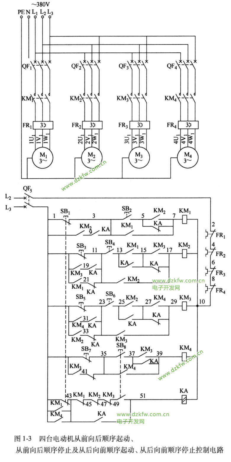 當(dāng)需要從后向前順序起動控制時,則先按下第四臺電動機(jī)M。的起動按鈕 SB,SB;的一組常開觸點(diǎn)(49-51)閉合,中間繼電器KA線圈得電吸合且KA常開觸點(diǎn)(43-51)閉合自鎖,KA所有常閉觸點(diǎn)(5-7、15-17 11-21、23-33、27-29、35-41)閉合,所有常開觸點(diǎn)(3-9、11-19、13-15、23-31、25-27、37-39、43-51)閉合,為從后向前順序起動,從后向前順序停止做準(zhǔn)備。在按下 SB;的同時,SB;的另一組常開觸點(diǎn)(35-37)閉合,交流接觸器KM 線圈得電吸合且KM,輔助常開觸點(diǎn)(35-39)閉合自鎖,KM,三相主觸點(diǎn)閉合,電動機(jī) M,得電先起動運(yùn)轉(zhuǎn)了;同時KM。輔助常開觸點(diǎn)(1-43)閉合,防止誤按動 SB時的順序轉(zhuǎn)換;與此同時,KM。輔助常開觸點(diǎn)(1-31)閉合,將鎖住 SB;(1-23)使其失去作用;KM。輔助常開觸點(diǎn)(27-29)閉合,為允許KM;線圈得電吸合做準(zhǔn)備。再按下第三臺電動機(jī)M的起動按鈕SB。(23-25),交流接觸器KM線圈得電吸合且KM,輔助常開觸點(diǎn)(23-29)閉合自鎖,KM,三相主觸點(diǎn)閉合,電動機(jī)M得電起動運(yùn)轉(zhuǎn)了;同時KM,輔助常開觸點(diǎn)(1-19)閉合,將鎖住 SB;(1-11)使其失去作用;KM,輔助常開觸點(diǎn)(15-17)閉合,為允許KM線圈得電吸合做準(zhǔn)備。再按下第二臺電動機(jī)M的起動按鈕SB。(11-13),交流接觸器 KM線圈得電吸合且KM輔助常開觸點(diǎn)(11-17)閉合自鎖,KM三相主觸點(diǎn)閉合,電動機(jī)M得電起動運(yùn)轉(zhuǎn)了;同時KM輔助常開觸點(diǎn)(1-9)閉合,將鎖住 SB;(1-3)使其失去作用;KM輔助常開觸點(diǎn)(5-7)閉合,為允許KM,線圈得電吸合做準(zhǔn)備。最后按下第一臺電動機(jī)的起動按鈕SB,(3-5),交流接觸器KM線圈得電吸合且KM輔助常開觸點(diǎn)(3-7)閉合自鎖,KM,三相主觸點(diǎn)閉合,電動機(jī)M得電最后一個起動運(yùn)轉(zhuǎn)了;同時KM,輔助常開觸點(diǎn)(1-43)閉合,短接 SB(1-43),防止誤按停止按鈕 SB,時出現(xiàn)轉(zhuǎn)換。至此,四臺電動機(jī)完成從后向前手動逐臺順序起動控制。