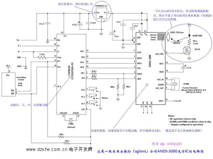 一、USB 光電鼠標(biāo)。圖1 為使用GL603 - USB 鼠標(biāo)IC 芯片及安捷倫的H2000(400CPI、每秒1500 次掃描) 為光電感應(yīng)芯片的電路圖。
