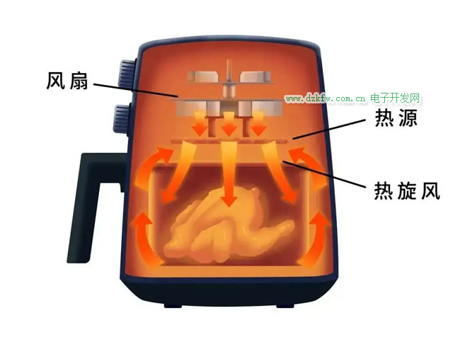 空氣炸鍋是實現空氣炸的設備,其構造比較簡單。現在的空氣炸鍋基本上是一個高轉速的風扇下面接一個螺旋加熱管,加熱管周圍配上溫度傳感器,再搭配一個裝食材的炸鍋(炸籃)。機器運轉時風扇高速旋轉,不斷地將加熱管附近的高溫空氣吹向炸鍋,使炸鍋內的空氣快速循環,最終達到高溫空氣包裹食材的效果。