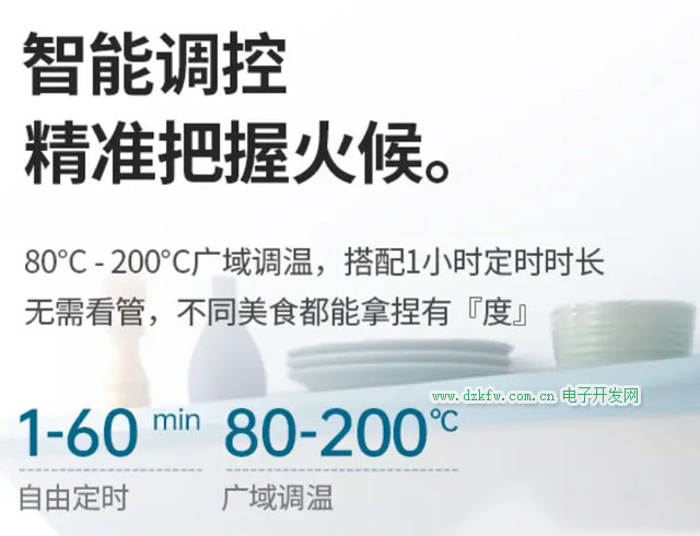 重要參數二:溫控加熱裝置的第二個重要參數是溫控,也就是溫度傳感器的靈敏度。空氣炸鍋也好,烤箱也好,能做到精準控溫,腔內溫廠均勻是很難的,但是控溫越準,做出來的食材受熱越均勻,小白操作的成功率也越高。對于空氣炸鍋來講,提高溫控精確度的方式主要為增加溫度傳感器的數量和質量,提高風扇轉速,增加扇葉數量,加大扇葉面積。