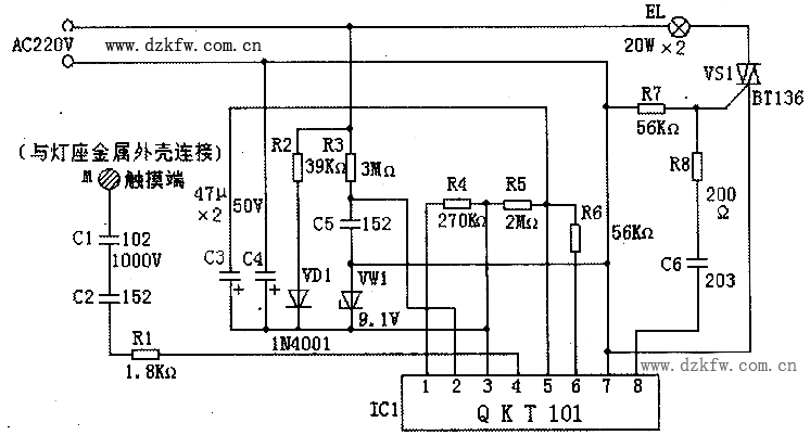 筆者未修理過觸摸式臺燈,也不清楚其工作原理,但根據(jù)實物很快便畫出了該臺燈的電路圖(見附圖)。按圖索驥.對電路板上的元器件檢測了一遍,卻沒有發(fā)現(xiàn)損壞的元器件,使維修陷入了僵局。