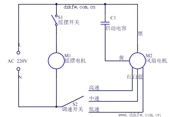 從上圖可以看出,此電路一共可以分為三大部分,最左邊的220V交流電源電路,中間的搖擺電路,最右邊的風機電路。電風扇電機是單相交流電機,它的內部有兩個繞組,一個叫運行繞組(也稱主繞組),另一個成為啟動繞組(也成為副饒組)。啟動電路由分相電容組成,使主副繞組在空間上相隔90°電角度。調速電路是串聯一個電抗器調速開關組成,通過調電抗大小,來改變電機的電壓實現調速。弄明白這個電路圖后,足以修理電風扇了。