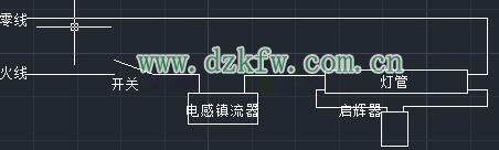 從圖中看一個燈控開關、一個電感整流器、一個打火(啟輝器)、一根燈管連在一起通電后,合上燈控開關,電源通過鎮流器和燈管燈絲加在啟輝器的兩極,220V的電壓使啟輝器氖泡內的氖氣電離產生輝光,使氖泡內動、靜觸頭片膨脹接通,整個回路接通。此時啟輝器兩極等電位,氖泡內不再輝光放電,溫度降低后動、靜觸點收縮斷開,瞬間鎮流器產生一個感應電動勢與電源電壓加在一起,使燈管燈絲發熱產生電子,電子高速從低電勢竄到高電勢,碰撞燈管內的氬氣使之電離將燈管點亮。