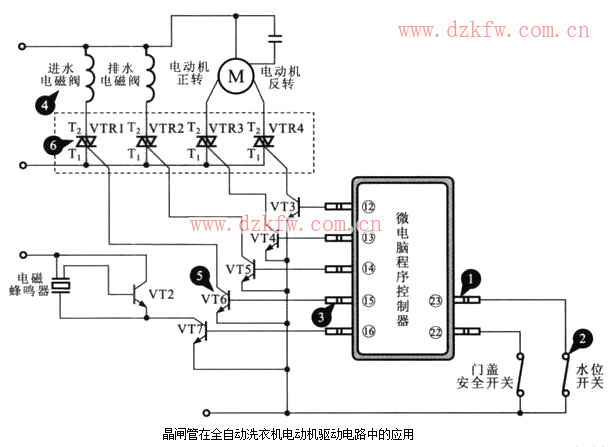 當(dāng)某三極管基極有高電平時,三極管便導(dǎo)通,相應(yīng)的晶閘管被觸發(fā),被控制的電磁閥動作,如開始洗滌,微電腦程序控制器的23腳連接的水位開關(guān)和15腳連接的進(jìn)水電磁閥配合工作,控制洗滌桶內(nèi)的注水量。當(dāng)水位達(dá)到預(yù)定水位后,微電腦程序控制器將進(jìn)水電磁閥的控制三極管VT6截止,晶閘管VTR1截止,則停止向洗滌桶內(nèi)注水。