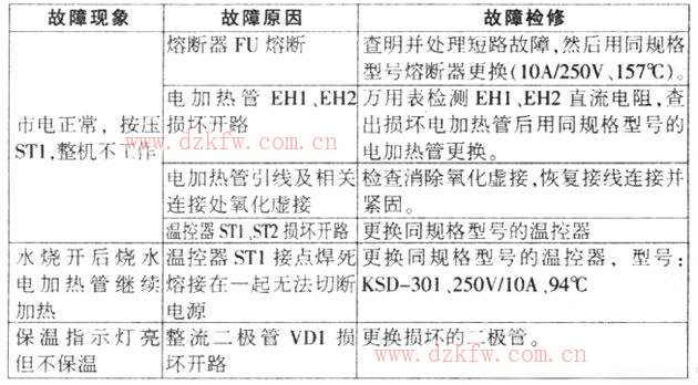 當瓶內重新注入冷水后,水溫下降,燒水溫控器ST1自動復位閉合。接通電源,電熱開水瓶重新再把水燒開。溫度熔斷器FU、燒水溫控器ST1啟動,當瓶內無水或電路有短路故障時溫度迅速上升,自動熔斷或動作斷開,切斷電源,實現對電加熱的保護。該開水瓶故障檢修見附表。