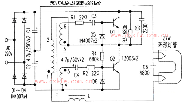 該燈具為廣東產環形日光燈管,型號為NTA-Y21X,額定電壓AC220V,輸入功率21W。按實物測繪出該燈電路圖(如附圖所示),供參考。