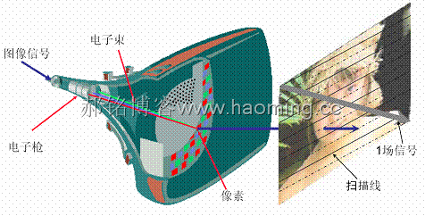 顯像管:俗稱CRT,它是一個電真空器件,由涂有熒光粉的屏、電子槍及一個真空的腔體組成,是一個體積較大的玻璃椎體。成像原理是;依靠電子槍發射高速電子束流;轟擊熒光屏產生光點;圖像信號的控制使電子束流強弱變化,在熒光屏上產生“亮”、“暗”變化的光點(這光點就是像素);再依靠偏轉作用使電子束在熒光屏上進行規定的掃描,把“亮”、“暗”變化的光點按規定的順序排列起來形成圖像,如圖1-1-1所示。顯像管屬于顯示屏主動發光的模擬顯示器件。