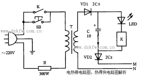 如圖所示,SB為啟動按鈕開關,使用時,水位撿漏電極A、B與加熱管一同放入注滿水的暖瓶中,按一下SB,變壓器T初級發熱管降壓有交流電通過,經升壓,次級得到12V左右的交流電,經VD整流及水位檢測電極M、N之間的水電阻,在C上形成10V左右的直流電,供給繼電器K動作之用,K為動作電壓為8V的小型繼電器,發光二極管LED為工作指示燈,當繼電器K吸合時,LED亮,同時觸點K閉合,電熱管RL得電加熱。當SB松開時,繼電器處于自保持狀態,K一直處于閉合狀態,RL保持加熱,當瓶中的水沸騰時,由于劇烈的空化作用形成氣泡,使M、N間瞬時斷開,K失電,K斷開,完成加熱過程。