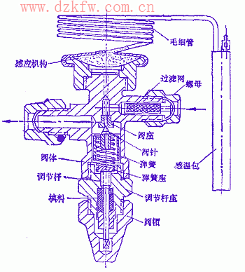 調節桿通過調整彈簧力的大小來調整膨脹閥的開啟過熱度。傳動桿頂在閥針座和膜片剛心之間以傳遞壓力。閥針座上裝有閥針,隨著傳動桿的上下移動,閥針也跟著閥針座一起移動,開大或關小閥孔。