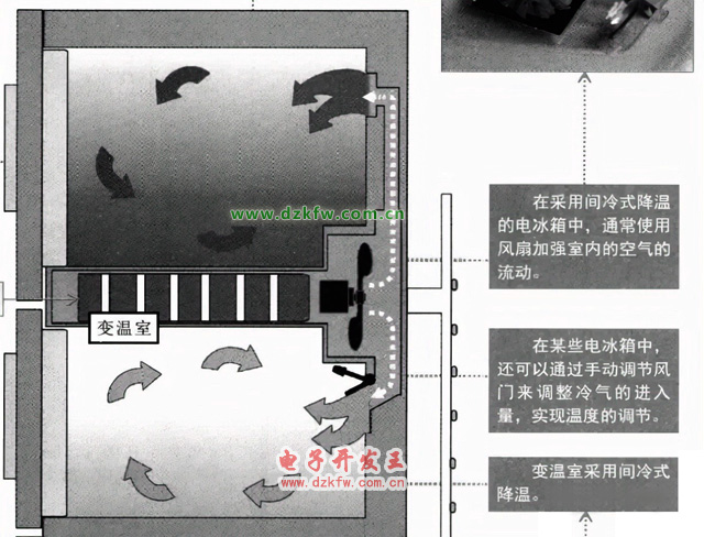 電冰箱箱室內通過加快空氣流動或自然對流的方式,使空氣形成循環,來提高制冷效果。這種冷氣循環方式通常可分為冷氣自然對流降溫方式(直冷式降溫)和冷氣強制對流降溫方式(間冷式降溫)。