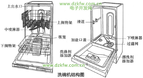 洗碗機的結構主要有:外箱體、內箱體、餐具架、噴射結構、葉輪或噴臂、電動機、洗滌泵、排水泵、程序控制器、壓力開關、電磁閥、加熱器等組成。