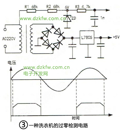 一種洗衣機的過零檢測電路如圖3,該洗衣機220V交流電源和低壓部分沒有隔離元件,低壓+5V和AC220V是連通的,過零信號直接從AC220V取樣,經取樣電阻R1、R2降壓由zD穩壓管鉗位為6V矩形波,由于220V交流電壓負半周時穩壓管正向導通,導通電壓僅0.7V,所以一個周期內只有一個正向矩形波,矩形波的上升沿是一個過零信號,下降沿又是一個過零信號。由于穩壓管的反向擊穿曲線比較緩,所以這個脈沖的二個角是圓的。由于矩形脈沖較寬,在6V穩壓管上可以測到2V左右的直流電壓。