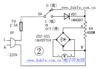 兩擋調(diào)溫電吹風(fēng)電路原理如下圖2所示。電路中,XP為電源插頭,F(xiàn)U為保險絲,SA為選擇開關(guān),VD1為半波整流管,EH為發(fā)熱絲(400W),VD2~VD5為橋式整流器,M為直流電機(jī)。將XP插進(jìn)市電插座,SA置于Ⅱ(高)擋時,EH以全功率加熱。通過發(fā)熱絲抽頭降壓,經(jīng)VD2~VD5橋式整流獲得約14v直流電壓供M工作。直流電機(jī)M高速轉(zhuǎn)動,驅(qū)動風(fēng)葉轉(zhuǎn)動,空氣由進(jìn)風(fēng)罩進(jìn)入,經(jīng)發(fā)熱絲加熱的空氣由前筒吹出熱風(fēng)。此擋溫度高,風(fēng)量大。SA置于I(低)擋時,電源經(jīng)VD1半波整流向EH、M供電,此擋溫度、風(fēng)量減半。SA置于OFF(停)擋,切斷電源,電吹風(fēng)停止工作。