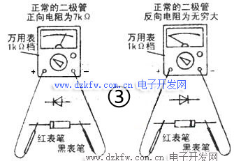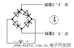 (2)、橋式整流器擊穿燒壞。按圖1(c)拆出發(fā)熱芯,不必焊下二極管。將萬用表置于Rx1k擋,分別測量VD2~VD5正向電阻和反向電阻,測量方法如圖3所示,測量過程中發(fā)現(xiàn)VD2-VD5均擊穿開路,導(dǎo)致無14V直流電壓而引起所述故障。用4支1A/1000V(1N4007)硅整流二極管按圖4連接,整流器正端接直流電機(jī)“+”端,負(fù)端接直流電機(jī)“-”端。通電試機(jī),電吹風(fēng)正常吹熱風(fēng),故障排除。