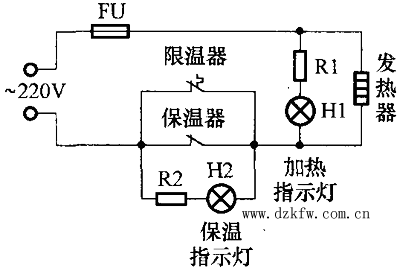 整個電路由熱熔斷器   FU、發熱器、限溫器、保溫器、加熱指示燈和保溫指示燈等部分組成。接通電源后,電熱發熱器為內鍋加熱煮飯,飯煮好后限溫器自動切斷發熱器電源,電飯煲進入保溫階段,自動控制在約70℃的溫度范圍。