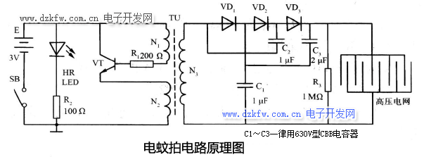 該電路主要由高頻振蕩電路、三倍壓整流電路和高壓電網三部分組成。