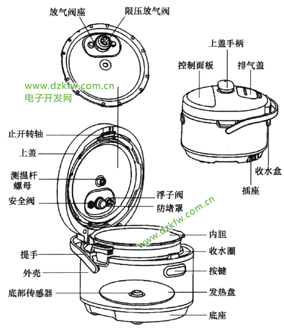 電壓力鍋外部主要由上蓋手柄、上蓋、限壓放氣閥、浮子閥、外殼、控制面板等組成。