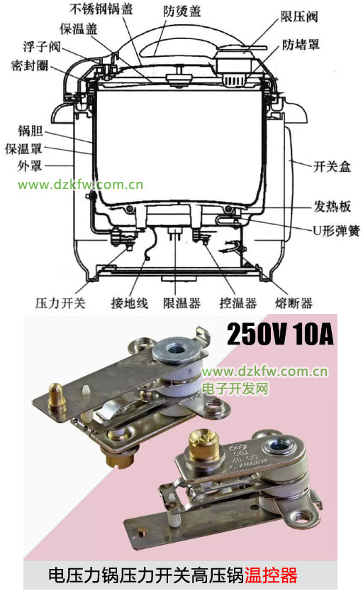 壓力開關主要用于控制電壓力鍋內的壓力,當電壓力鍋內不斷變化的壓力增大到觸動了預先設置的冷卻開關,其斷開停止加熱,而完成控制壓力的工作。