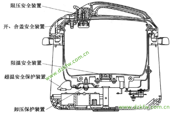 電壓力鍋內部安全裝置主要有開合蓋安全裝置、限壓安全裝置、限溫安全裝置、超溫保護裝置、泄壓安全裝置。