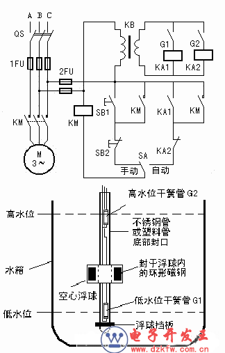 圖中,控制變壓器380V/24V,水箱內外的控制線路用24V安全電壓供電。管子用直徑25毫米的薄壁不銹鋼管或硬質塑料管,單端封口。