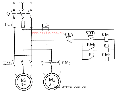 工作原理:合上電源開關(guān)Q,按下啟動(dòng)按鈕SBTI。此時(shí)時(shí)間繼電器得電,接觸器KMI同時(shí)得電吸合并自鎖,電動(dòng)機(jī)MI先轉(zhuǎn)。時(shí)間繼電器KT延長(zhǎng)一定時(shí)間后,延時(shí)閉合的常開觸點(diǎn)KT閉合,接觸器KM2得電吸合,其主觸頭閉合,電動(dòng)機(jī)M2開始運(yùn)轉(zhuǎn),電動(dòng)機(jī)M1和M2保持同時(shí)運(yùn)轉(zhuǎn)。