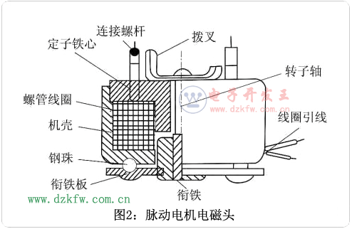 電磁頭部分包括定子和轉(zhuǎn)子,如圖2所示。定子由定子鐵心、機(jī)殼和螺管線圈等組成。轉(zhuǎn)子由轉(zhuǎn)子軸、撥叉和銜鐵板等組成。