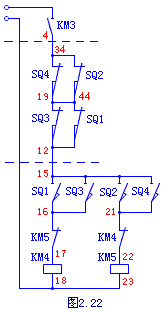 銑床工作時,不允許工作臺的各向進給同時接通,通常采用的聯鎖方案是:當兩個進給手柄同時扳動時,立刻切斷電源。圖2.22即為這種聯鎖控制線路。