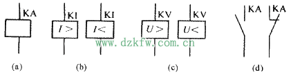 (a)線圈一般符號;(b)過電流、欠電流繼電器線圈;(c)過電壓、欠電壓繼電器線圈;(d)動合、動斷觸點