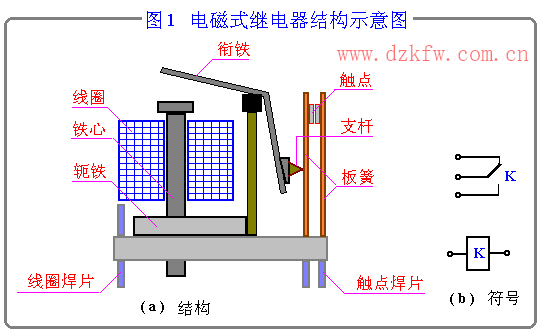 電磁式繼電器是以電磁系統為主體構成的,圖 T319 為電磁式繼電器的結構和符號示意圖。